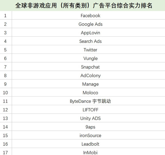 日韩市场休闲游戏和中核&策略游戏广告平台实力排名 南亚(印度)休闲游戏和中核&策略游戏广告平台实力排名 2、非游戏应用有更多本地广告渠道可选择 与游戏形成反差的是,非游戏榜单上榜的广告平台数量与以前相比变化不大,渠道数量比游戏多 50%。也就是说,对于非游戏应用而言,营销人员有更多本地广告平台可以选择。