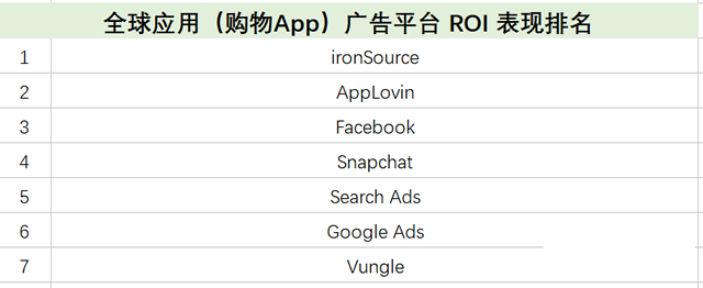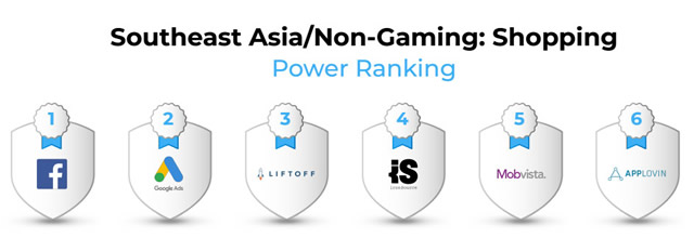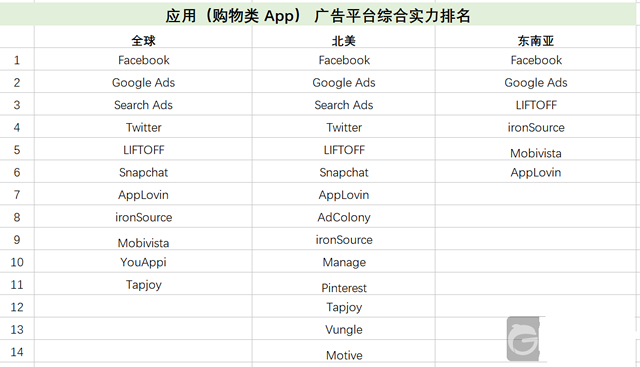 全球购物类 App 广告平台实力排名 我们以北美(发达国家市场)和东南亚(新兴国家市场)为例,分别看看在现阶段出海电商主要面向的区域市场,不同广告渠道表现如何。