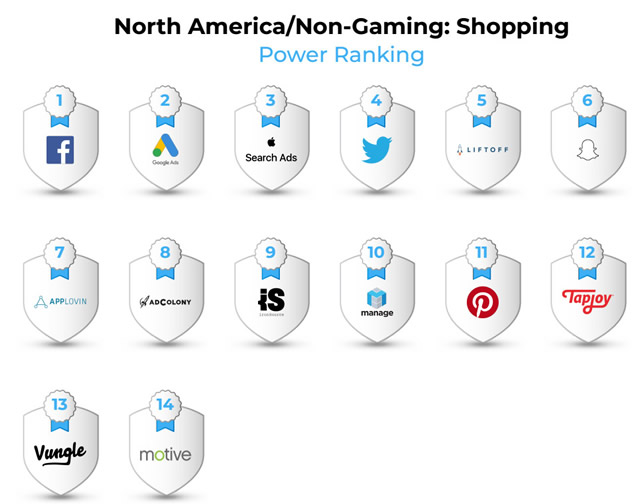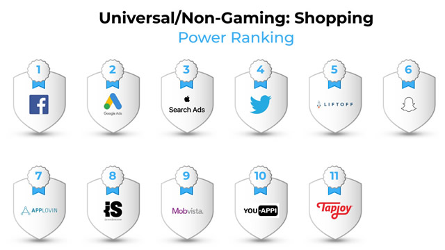此次调查数据显示,Facebook 以用户庞大的用户规模和出色的用户质量,在购物类 App 众多媒体渠道中占据主导地位。基于一项有力的购物意愿信号 — 搜索关键词,Google 和 Apple 搜索广告紧随其后。此外,Twitter 和 Liftoff 在购物应用程序方面也表现良好。