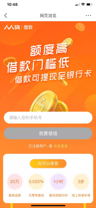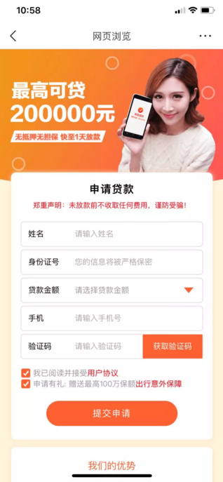 1)新旦的外层图片选用了绿色的 冷色调,一来与头条原本的红色相悖,二来与钱相关的我们更建议使用 暖色调,这样能激发用户对金钱的欲望; 2)图片素材设计上,新旦脱离了 钱的使用场景,而人人贷是运用了手机支付微信零钱的场景,更加原生,让用户瞬间进入场景当中; 因此从创意层级人人贷更胜一筹。 落地页对比: 新旦: