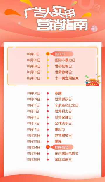 白驹过隙,时间已渐近10月,对营销人来说,与秋高气爽的好天气一同到来的还有新一轮的营销节点—— 金秋十月,我们将迎来国庆黄金周、二十四节气中的寒露和霜降、传统节日重阳(又称老人节)智能营销方案,还有独具互联网属性的1024程序员节等,此外,诸如东京国际电影节这种大型活动也将在10如何在论坛中推广月拉开帷幕。 善谋者胜,我们已经为大家将10月重要营销节点提前梳理好啦↓↓↓ ![]()