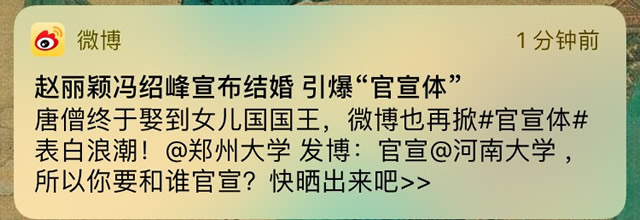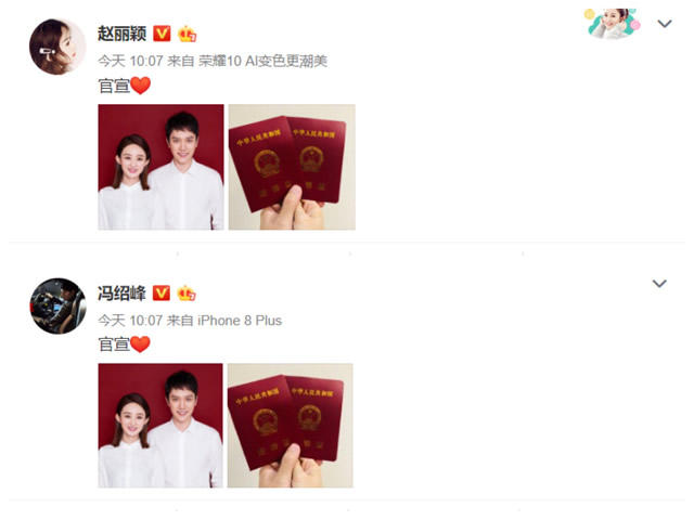 正在昏昏欲睡的工作中,被一则消息炸到清醒,赵丽颖和冯绍峰同时发布微博,直接晒出了结婚证!