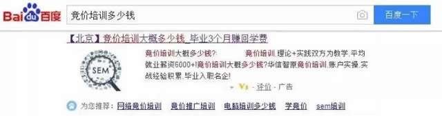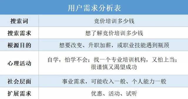 用户需求分析表 分析完后,我们基本就了解了:用户想看到什么?什么样的创意更能满足用户需求?接下来便是优化创意。 从分析表中,我们可以看出用户比较在意价格,那我们是否可以在创意中加入“价格一览表”之类的信息。或者以工资来影射费用。例如“竞价培训多少钱?毕业3个月赚回学费”。如下图。