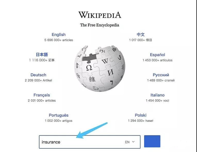 那么,在针对content marketing写高质量文章时,除了一般的目标关键词优化外,还要让内容里适当地包含这些语义相关词,做好了谷歌语义SEO,你的内容才会被谷歌蜂鸟所喜欢所认可。 2、在Title Tags里加入长尾词 众所周知,长尾词的SEO难度普遍小于目标词,也就是说,在同样的时间内,相比较于主词,其相关的长尾词(可用kwfinder、UberSuggest等工具来获得)更容易优先获得高排名,带来搜索流量和外链; 然后,随着页面权重的不断上升,主词的排名也会逐渐快手流量卡推广上升,这就是长尾词对主词排名的带动作用。 Title Tag优化,是SEO的重要环节之一,在Title tag里除了布置目标词,如果也融入了相关长尾词,那么长尾词会更容易上排名,你的页面会更容易先获得流量,主词也更容易上排名! 3、巧用Wikipedia来寻找关键词和topic 竞争对手还未盯上的关键词,SEO难度较小,更容易优化上排名。 那么,如何抢先一步去挖掘好的新关键词呢? 首先,停止使用Google Keyword Planner和Kwfinder等关键词工具,因为它们给出的基本都是一些关键词的紧密变体。 然后,转到维基百科wikipedia.org:(下面以insurance为例) 1)在首页输入关键词insurance,点击搜索