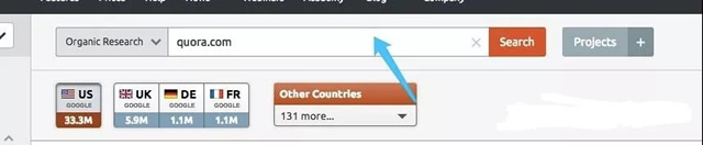 并且,长内容在移动搜索中也表现良好。 ok,为什么长篇内容有效?首先,长篇文章给谷歌传递一个信号:你为搜索者提供了更深入的信息,你的内容更有深度和价值;其次,长篇内容更有魅力,更容易让阅读者产生敬畏之情,而根据Pennsylvania大学的研究,让人们产生敬畏的内容的分享可能性要比一般的多30%!所以,小編建议大家在网站发表博客文章或者做客座博客时,要保证字数在1800+, 这样,你的文章深度和质量必然不错,关键词布局也会更完善更合理,分享量和外链也会很可观,排名自然就上去了。 另外,可能有朋友会说,我普通的产品描述可写不上这么多字啊,ok,没关系,只要立足用户体验,尽可能把用户的关注点考到虑并写进去,字数应该也会400+,也是可以的;页面不在多,在于精!对于区别不大,甚至只是外观不一致的的产品,尽量整合到一个页面去,一个长页面要比好几个类似的短页面好的多! 6、巧用Quora寻找内容创意 在Quora上被反复提及的问题,通常就表明:此问题在谷歌上目前没有很好的答案。也就是说,你的机会来了! 因为在Quora上被提及的较多,或者quora在谷歌排名较好的关键词通常在谷歌上都是低竞争力的,你在网站上做个页面,稍微优化一下,可能就会有不错的排名。 那么,如何找到这样的词呢? 转到Semrush或Ahrefs工具(这里我用的是Semrush),在输入框里输入quora.com,点击搜索: