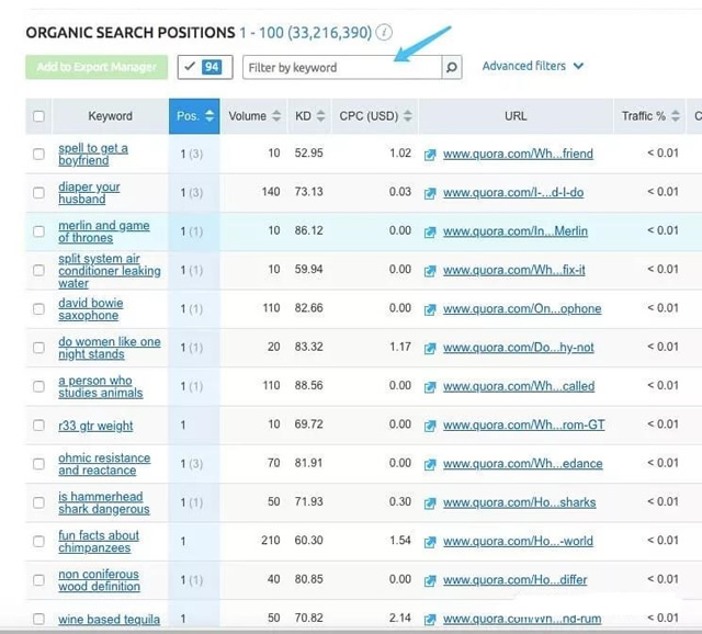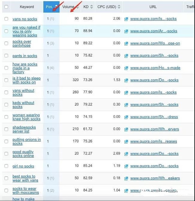 选择查看Organic Research,即quora这个网站在谷歌上的排名关键词,