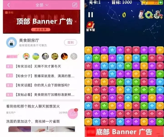 优势: 1、对用户干扰小,用户体验感和容忍度更高 2、更易躲过广告屏蔽软件,无形中增加品牌曝光率和节省广告预算 3、更符合人群兴趣,更易激发受众主动性,促进其接受、分享、二次传播等 应用广告劣势: 随着广告的常态化,以及用户新鲜感流失,其投放效果难以达到预期。日后会更加考验广告主的创意以及选材 二、banner广告 主要形式有:横幅广告、旗帜广告等。一般出现在APP界面顶部或底部,有静态图、GIF图、文字链、或多帧图片滚动的动画图等表现形式。