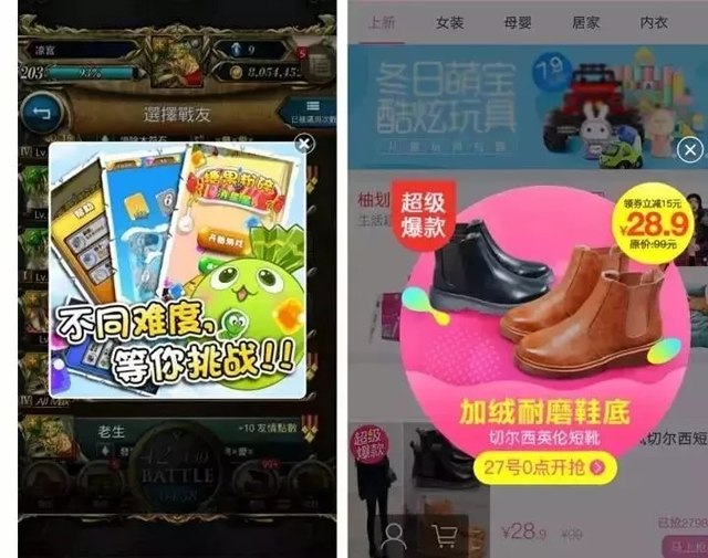 优势: 1、对受众干扰小 2、制作相对简单 3、竞价成本相对较低 劣势: 1、容易被受众忽略 2、若设计粗糙或定向不够精准,容易影响受众上网体验,从而造成不良品牌印象及广告费浪费。 三、插屏广告 一般在应用(游戏、视频应用居多)暂停、过关、跳转、退出时以半屏或全屏的形式弹出,展示时机巧妙避开用户对应用的正常体验,用户可选择点击或忽略。 表现形式主要是静态图、GIF 图等。