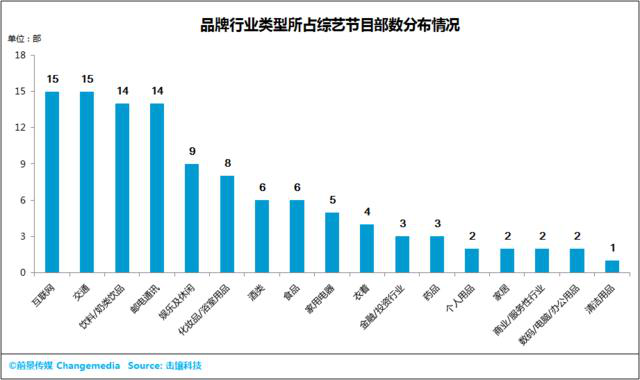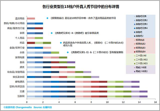 从品牌行业分布来看,在这15档户外真人秀节目中,互联网、交通行业全部有植入,饮料/奶类饮品、邮电通讯也占到14档,这四类品牌行业成户外真人秀植入热门,青睐值极高。除发布公司信息的网站此之外,娱乐休闲、日化、酒类、食品等在节目中也十分常见,药品、衣着类则与户外竞技的理念十分契合。 2、行业品类植入节目选择空间大,药品、衣着行业有待继续挖掘