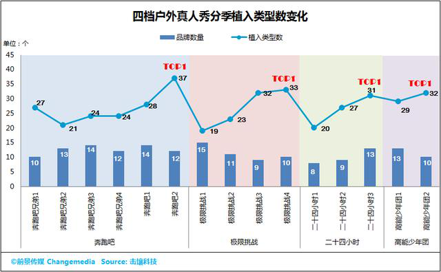 除了互联网、邮电通讯、饮料/奶类饮品、交通这些常见行业品类外,户外真人秀也深受其它行业喜爱,其中个别品类还有待继续挖掘。如药品类,对于以竞技游戏为主的户外真人秀,意外受伤很常见,因此药品类十分契合,在《极限挑战4》中盘龙云海,《二十四小时1&3》999均有植入;在衣着品类中海澜之家、斐乐均作为服装赞助了《奔跑吧兄弟1-3》《二十四小时2》。同时其它品类,如清洁用品好爸爸洗衣液仅出现在《极限挑战2》,家居、数码办公类也仅在《奔跑吧兄弟3&4》《奔跑吧》中出现。因此行业品类植入还具有很大的选择空间。 植入类型 1、植入类型升级种类丰富,新一季植入类型数最高