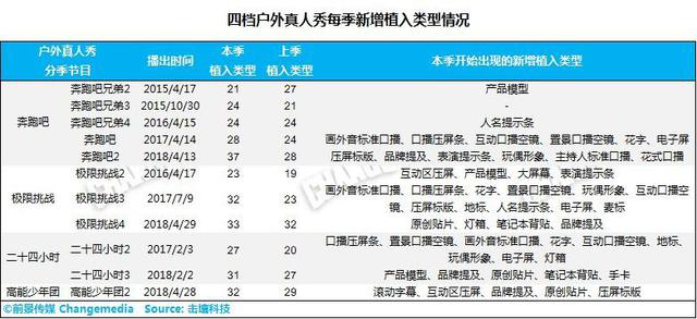 从这四档户外真人秀植入类型数的季播化趋势来看,植入类型是在逐年不断升级和丰富的。在最新一季的节目中植入类型数均达到最高。其中2014年开播的现象级综艺《奔跑吧兄弟》第一季就已经在植入类型上做到绝对性突破,权益类型十分丰富,到2017年《奔跑吧》权益种类才再迎突破! 2、创新性植入权益不断涌现,常规性植入权益迎来升级 从每季新增植入类型来看,创新性植入权益不断涌现,在2017年,花字、玩偶形象、灯箱、电子屏、互动/置景口播空镜等开始出现在户外真人秀节目中,到2018年品牌提及、原创贴片、笔记本背贴应运而生。