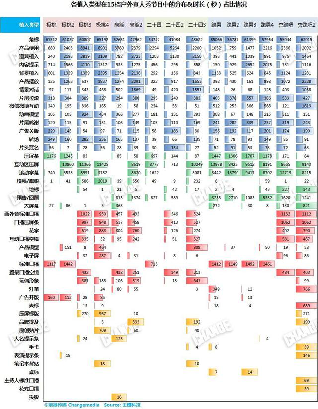综上所述,竞技类户外真人秀相较棚内综艺来说,场景更多,植入空间更大,品牌合作受限较小,因此吸引客户品类更加丰富。互联网、交通、饮料/奶类饮品、邮电通讯、鞋服、药品、食品等品类与节目契合度高,且捆绑代言人能达到深入宣传效果。同时由于场景变动大,因此对于预算较少的客户来说,单期植入效果也较佳,绑定节目进行整期宣传。