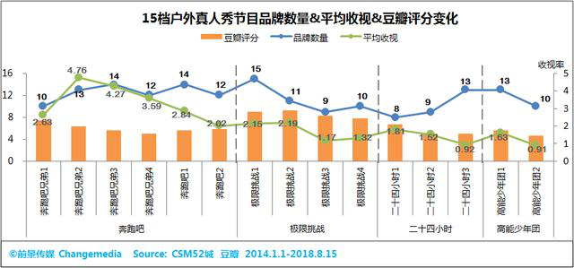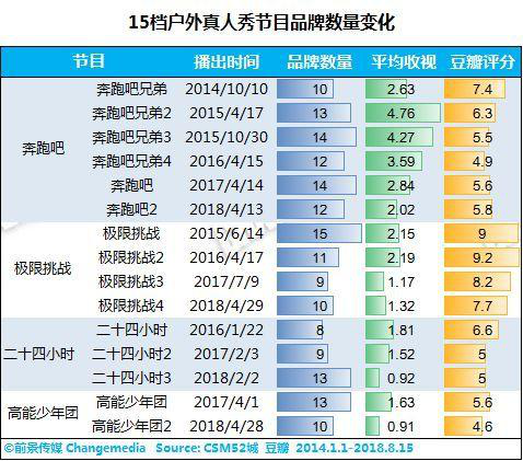 户外真人秀的发展历程最早可追溯到2000年,中国首个户外真人秀节目《生存大挑战》诞生开播,随后,《峡谷生存营》、《走入香格里拉》等多档野外生存节目相继出现。但好景不长,尚处于发轫期的户外真人秀节目,迅速被如火如荼的选秀节目挤下了电视主流市场。在默默无闻了10余年之后,中国户外真人秀终于在2013年迎来了属于自己的“黄金时代”。 2013年,《爸爸去哪儿》一炮而红,引爆了户外真人秀的热潮。国内各大卫视争相从海外引进版权,《奔跑吧兄弟》、《极限挑战》等多档现象级节目陆续“出世”,综艺节目正式进入户外真人秀的霸屏时代。 同时,户外真人秀也成为最热吸金节目的首选,冠名费用也在不断走高。电视荧屏不乏各类以游戏竞技为主的户外真人秀的身影,且以“综N代”的形式不断霸屏。因此,竞技类户外真人秀究竟吸引了哪些金主爸爸们的青睐?又是如何通过玩转电视植入成为吸金大热门?且季播化下的“综N代”们品牌植入呈现了怎样的趋势走向?本文选取了目前时下竞技类户外真人秀中的现象级综艺节目《奔跑吧》《极限挑战》,后起之秀《高能少年团》《二十四小时》这四档季播节目(共15季)进行了广告品牌和植入的全解析,从四大角度深入探讨户外真人秀的品牌植入之路的变化与趋势!