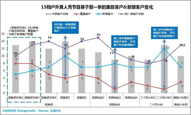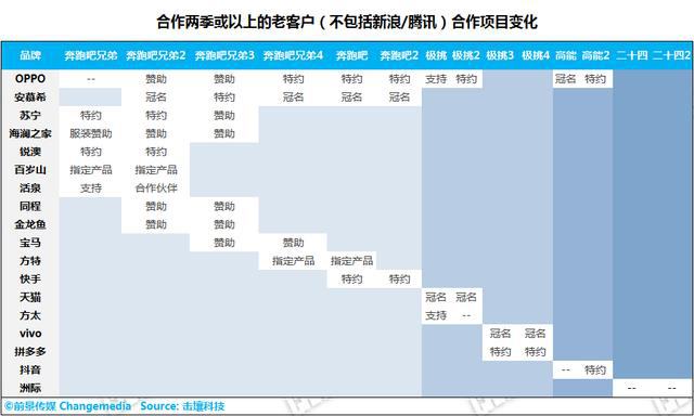3、前期客户留存高后期新增品牌多,多数品牌连续合作看重常熟推广网站节目价值 户外真人秀的客户留存率在前几季优势明显,众多老客户选择再度合作,随后开始被新增客户替代。其中《奔跑吧兄弟》第二、三季重叠客户更是高于新增客户,第一季中10个品牌有8个品牌选择继续合作第二季,留存率极高。《极限挑战》《二十四小时》《高能少年团》在第二季的时候也有少许客户选择连续合作,到第三季后开始全部由新增客户取代。 对于连续合作两季或以上的老客户来说,合作项目也有不同,如天猫、VIVO两季冠名《极限挑战》、拼多多,快手分别两季特约《极限挑战》《奔跑吧》;《奔跑吧》OPPO从赞助到特约,《奔跑吧舆情监测技术方案》安慕希从冠名到特约,《高能少年团》OPPO从冠名到特约等。而在单期植入中,抖音从《高能少年团》第一季的单期植入到第二季成为特约,方太则从《极限挑战》第一季的支持到第二季以单期植入再次合作,都体现了这些品牌对竞技类户外真人秀节目的青睐。