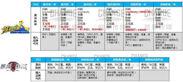 4、阵容变化吸引全新品牌入驻,借助明星代言让宣推更给力 对于走过了几季的竞技类户外真人秀来说,嘉宾人员变动频繁。除个别能保持原有阵容走下去的节目外,大多数都存在一定的阵容变化。尽管嘉宾阵容的变动会给观众带来一定落差感,但同样无法阻挡广告主对节目的关注,从而吸引更多全新品牌的入驻。