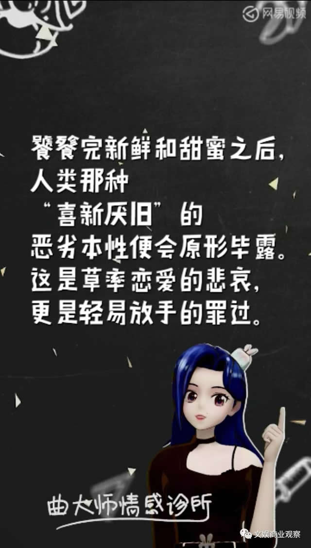 不论是新入局者还是从其他平台转过来的短视频网红,都面临着同一个问题:缺乏可认知的短视频IP。 短视频网红与短视频IP是有着本质上的不同。网红只是一时的现象,缺乏长远的规划,大部分网红的生命周期都是的短暂的,只能火一时而不能长久拥有知名度,此外网红的变现途径十分单一,不具有延展性。 而短视频IP则不同,IP一般具有高粘度、高活跃的粉丝,在大众层面有着深刻地认知,可以全面、多层次的进行商业化开发。 因此对于短视频平台而言,目前短视频网红已经够多了,抖音、小红书上粉丝过百万的大V太多,但是能够形成IP价值的寥寥无几。 网易新闻孵化《曲大师情感课堂》IP,塑造情感虚拟偶像“曲大师” 为了解决这种行业痛点,打造一个可以持久发展的短视频IP,网易新闻轻松一刻工作室推出的动作捕捉情感知识增量栏目《曲大师情感课堂》,打造情感虚拟偶像“曲大师”。 其中,轻松一刻与影视工业网联合出品的段子剧,抓住现代都市人的痛点,以各场景趣事为蓝本,节目形式为一分钟短视频,备受用户认可,20期节目不仅在全网收获了3000万播放俩个,更一举斩获2017年映像4k松下视频大赛大奖。 此次原创的《曲大师情感课堂》以虚拟的课堂互动为形式,新颖有趣,比如最新的一期“冲破恋爱套路:女生话里的那些潜台词&r危机公关有什么作用dquo;中,列举了男女交往过程中女生的日常潜台词,“女人最大的套路是什么?口是心非!” 粉丝们在这一期下面留言“单身狗们还不努力一点”,说明大家对这种动画形式普及交往知识是接受的,这些年轻人情感+社交的需求是十分强烈的。 此前轻松一刻在节目推出之前曾经做过一个用户画像,分析众多粉丝画像后发现曲一刀/轻松一刻的大多数用户是社会层级分布广泛,其中单身男性占很大比重,对情感社交的需求较为普遍。 从整个年轻人群体角度来说,情感+社交也是刚需,时刻侵袭而来的孤独感让他们渴望与周边人交流。 全球知名的保险以及医疗服务公司Cigna与市场调查公司Ipsos在今年年初对两万多名18岁以上的美国居民进行民意调查。调查结果令人吃惊:全国孤独指数为惊人的44(孤独指数范围是:20~80)。而18~22岁的年轻人的孤独指数更是达到了48!而72岁及以上的老年人孤独指数只有不到39。 韩国招聘求职网站Job Korea和Albamon针对2613名韩国年轻男女(均为20多岁)进行了“孤独指数现状”调查。结果显示,58.5%的人表示自己孤独。对于感到孤独的理由,最多的是“社会竞争越来越激烈”(44.8%),其次为“社会两极化严重”。 这说明年轻人对于情感社交是刚需。因此《曲大师情感课堂》以情感+社交为切口陪伴当代年轻人的定位是正确的,出现是及时的。 虚拟经济火爆,曲大师掘金千亿动漫市场 《曲大师情感课堂》的运营本质上是虚拟偶像IP的养成之路。