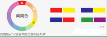 相邻色由于比较邻近,有很强的关联性,很协调柔和,画面和谐统一,可以制造一种柔和温馨的感觉,因为在色轮中位置比较近,对比比较弱,所以这种搭配视觉冲击力比较弱 3) 色彩搭配---间隔色搭配法 根据红橙黄绿蓝紫这六个字的顺序,间隔一个色就有红黄、橙绿、黄蓝……、