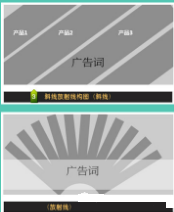 ③斜线放射线构图法 其分为斜线和放射线两种,斜线具有运动,流动的感觉,因此常用在运动装备,细长的文具等产品上。 放射线以主题为核心,元素向四周呈放射状散布,常用于需要突出主体,而场景复杂的情况