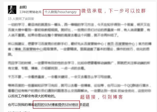 推广时,我们不仅要考虑流量的精准性,还有考虑流量所处阶段。所以我们在做渠道时,要尽可能地增加承载通道,用多个通道去承载不同类型的流量,既避免了流量的大幅度流失,又增加了后期转化的机会。 转化通道太过单一 很多人在做渠道时,尤其是免费渠道,在转化方式上总是太过单一。这就有可能造成:一部分流量转化;而另一部分流量流失。 在做竞价时,我们都至少会使用电话、咨询、表单等多种转化方式,就是为了满足用户的多方位转化需求。那在做渠道时,为什么就不能设置多个转化方式呢? 比如下图,是我们自己做的一个推广。在内容顶部我们设有微信转化,内容尾部又有博客链接,尽力去避免流量的流失。