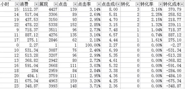 5、单一维度分析 指针对不同维度间的数据进行分析,从而确定优化方向。 单一维度主要可分为:产品维度、时段维度、设备维度、地区维度、关键词维度。以时段维度为例。我们可将某计划里的时段数据进行分析,从而确定哪个时段转化较好,哪个时段转化较差;然后根据数据修改推广方向。 像下图,可看出15点、14点、19点转化高,那我们便可在这段时间内加大投放力度。
