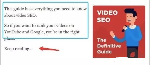 b.你可以利用google Ads,在对应的广告组里多设置几组广告,点击率最好的那个广告语可以适当应用到网页的Title和Description中; c.你可以研究竞争对手的网站Title 和Description,把自己想象成潜在用户,看看你会点击哪些网站,然后去糟粕取精华来优化自己的Title和Description。 总而言之,你需要深入研究用户心理,把握用户痛点,提高Title和Description的吸引力和竞争力! 2) 降低网站/页的跳出率+提高用户停留时间 Google RankBrain青睐让用户喜欢的内容,而喜欢程度的判断指标即 跳出率(Bounce Rate)+停留时间。 一般而言,跳出率越低,停留时间越长,Google排名就越高。大家不妨登录你的Google Analytics看一看,排名不错的页面肯定都是跳出率较低(60%以下)且用户停留时间较长(1分钟以上)。 那么,我们该如何做呢? a.内容一开头,不要啰嗦,尽量几句话讲清内容的价值,告诉读者你看完我的内容会得到什么。 并且鼓励人们继续阅读,比如,加个Keep reading,比如: