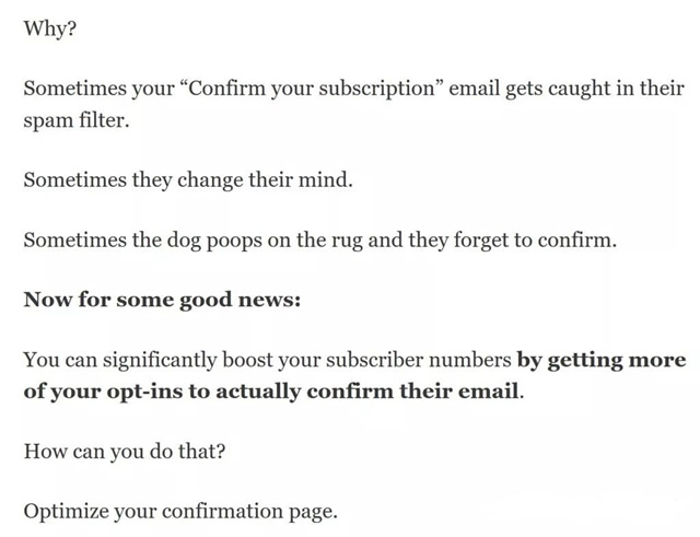 ③ 在权威页面布置站内链接 即进入②中得到的权威网页后台,做一些 指向①中得到的排名二三页的关键词的着陆页 的内链。 9、在邮件推广中善用“because”一词 我们写了新博客或者发布了新产品后,可以做些邮件营销,比如向网站的订阅者发送新文章推送邮件,向老顾客发送打折信息邮件等。 但是,在信息轰炸的时代,如何才能让用户不把你的邮件一键点到垃圾箱呢? ok,你可以尝试在内容里加上because这个词。用户在看到新邮件提醒的时候,其实脑海里会立马浮现两个问题:发邮件的是谁?和发邮件的人想要干嘛? 而你呢,如果在邮件里用because向用户简短快速地回答了这两个问题,则既给了自己发邮件的合法理由,也满足了用户的心理需求,就可能会获得较高的回复率!