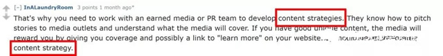 现在移动端的流量越来越大,小段落在移动端的可读性更强,这可以说是SEO的重要一点! 环新建议大家无论是写产品描述还是写文章,都尽量:紧扣用户需求,短小精悍,多用小段落或项目符号,提高可读性。 2、利用Reddit挖掘新关键字 Reddit常被称为“The Front Page of the Internet” (互联网的前沿),说的就是Reddit会有很多较新且可能即将风靡流行的话题(关键词)。 How? 前往Reddit。假如你已经知道目标受众常在的subreddit,直接前往;如果不知道,在Reddit内用关键词进行topic搜索。然后,看看结果中的subreddits和threads。 最后,一遍遍的反复浏览相应的threads,找出那些反复出现的关键词/术语。 因为如果某个话题若在Reddit上很热门,必会被人们反复提及。 举个例子,我在关于link building这个话题的相应threads中,发现“content strategy”和“content strategies”这几个术语反复被提到: