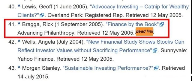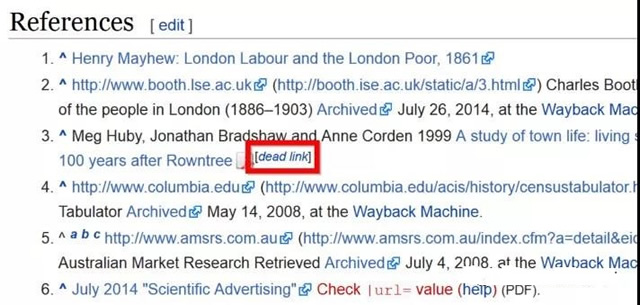 而它们正是我之前所没想到过的关键词! 3、不断更新优化旧内容 不断加新文章、传新产品,对旧内容置之不理。这是很多朋友会犯的一个错误。 其实,对于旧博客和旧产品描述,你需要不断为其注入新鲜血液,要让其跟得上时代,赶得上用户的新需求。 借助本来积累的权重,和不断更新的优质内容,排名不想上都难! 小编建议大家: a.每逢看到新的topic,要想想可不可以加到现有的网站内容里。 b.或者定期对网站进行关键词排名检查,当发现新的优质关键词,则要对TDK和内容进行适当优化。 改动之后,做做社交分享、外链,效果会相当可观! 4、充分利用维基百科(Wikipedia)上的Broken Links 大家都知道,来自高权重网站的外链对排名的影响极大,且获取难度也是堪比登山。 这里分享一个获取维基百科外链的小窍门! 当维基百科发现有死链时,他们通常不会立马删除,而是先在旁边标志一个(dead link),如下图: