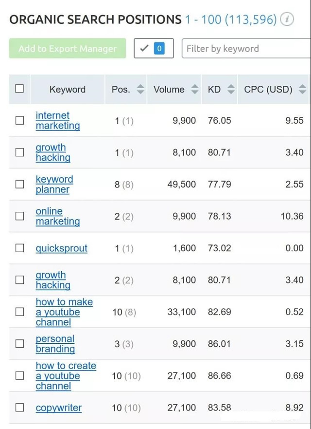 最后,得到竞争对手自然排名的关键词列表,从中选取有价值的关键词就OK了。