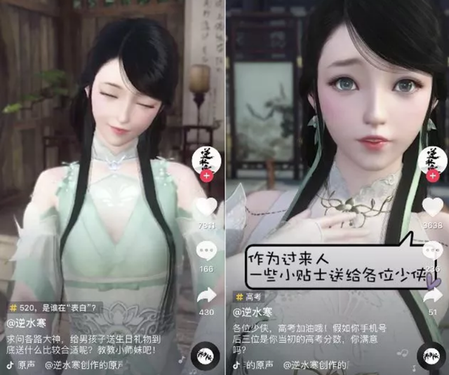 在众多模仿者中,《逆水寒》这支短视频排名第二,拿下了175.2万的点赞,当天帮助账号增粉10万。除了借势抖音火爆视频,借势节日热点和舆论热点也是不错的选择。比如《逆水寒》在高考和“520”都曾借势。