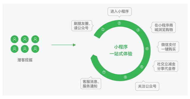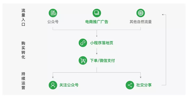 微信小程序一站式体验示意 小程序自身具有轻量易用、可反复触达的特点,微信广告依托庞大的用户量和丰富的数据支撑,将这两者有机结合,可为电商行业广告主提供与用户沟通的便捷通道,带动转化。用户在刷朋友圈、读公众号文章的过程中,通过点击电商广告进入小程序,在小程序商城内浏览购物,还可通过微信支付一键购买,下单成功后通过客服消息和服务通知获得订单状态,为用户购物带来了极大的便利。电商推广类广告,采用小程序落地页,真正做到“用完即走,走了还会来。”