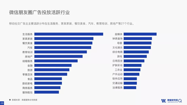 据调查,朋友圈广告投放活跃行业主要有生活服务类、家居家装、餐饮美食等27各行业,根据各个行业的特性以及广告主的广告业务模式、发展阶段和战略目标的不同,在营销过程中也会展现出个性化的诉求。2018年仍是微信快速发展的一年,去年小程序的出现给微信又注入了新的能量, 微信朋友圈广告的玩法越来越多,已然成为广告主竞相投放的阵地。