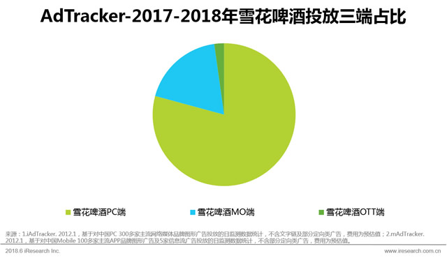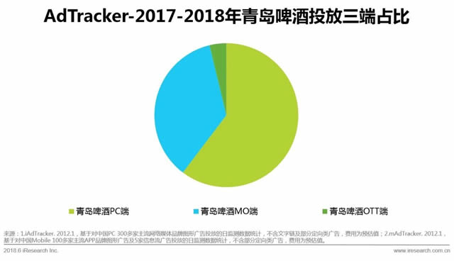 艾瑞数据显示,青岛啤酒和雪花啤酒在三端的投放比例不尽相同。双方都把主场放在PC端,都投放了爱奇艺、腾讯、新浪微博等热门媒体,其中雪花啤酒在PC端投放占比非常高。在MO端和OTT端,青岛啤酒投放量更多,投放比例也相对较大。