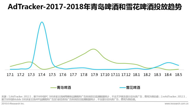 世界杯不仅是一场足球运动爱好者的盛宴,还是一次企业的绝佳时机。在众多世界杯经济阵地中,啤酒品牌与世界杯气质天然契合,畅饮啤酒成了国民新日常,品牌投放收获颇丰。 青岛啤酒为球迷上演&ld攀枝花网quo;欢聚俄罗斯,为世界杯举杯”的足球主题灯光秀,并推出油画质感的足球题材广告片《新地壳运动》,天下大同,全民狂欢,燃爆盛夏。雪花啤酒追踪世界杯全部赛事广告,并在《我爱世界杯》栏目上与球迷互动,邀请啤酒爱好者来节目现场。挚友与啤酒相伴,激情碰撞,全民参与足球运动小未程序小程序,成就一大乐事。有着德国基因的青岛啤酒浓郁香醇,令人迷醉。雪花啤酒口味清淡,适合开怀豪饮。你更喜欢哪一款呢? 从2017年以来的数据来看,青岛啤酒和雪花啤酒在广告投放趋势上各具特色。青岛啤酒总体投放量波动较小,在2017年第三季度广告投入偏多,9月出现了高峰值。 雪花啤酒特立独行,在部分时间段大批量投放,其他时候很少出血。2017年4月为宣传新品雪花“黑白啤”集中投放,形成超高峰值。2018年3月到5月,为迎接世界杯盛会,投放量明显上涨。