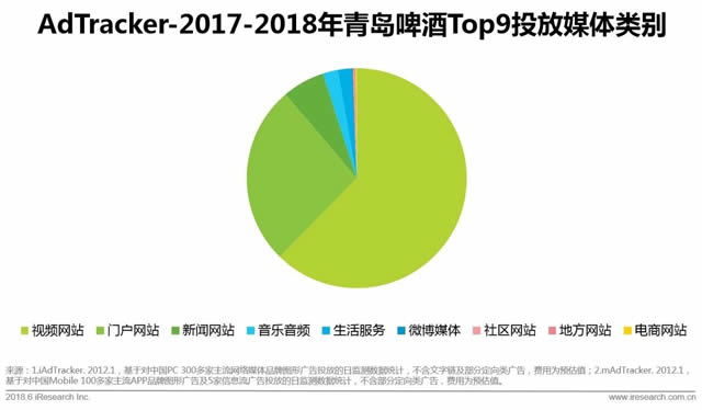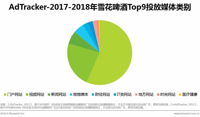 在投放的媒体类型方面,青岛啤酒把主力放在视频类媒体,雪花啤酒更青睐门户类媒体。而在垂直类媒体的选择上,二者也有很大差异。青岛啤酒选择了音乐、生活、社区、电商类媒体,雪花啤酒投在了财经、IT、时尚、健康类等媒体。