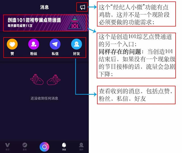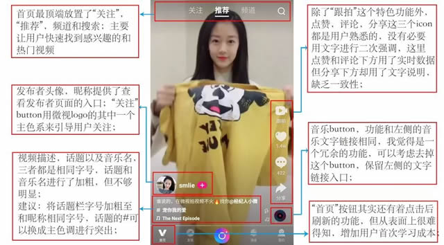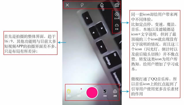 2.5 表现层 主要从UI设计评判的5个角度进行分析: ①色彩舒适度 主色调用了蓝紫红三种颜色,而且都是用了渐变过渡,显得比较柔和; ②文字的主次 文字上三者都表现尚可,按钮在选中的状态下都会变色来凸显。对文字的颜色和大小的设计使得文字都可以一目了然; ③信息可读性 微视的设计界面比较简洁,主要界面的功能模块基本做到错落有致,不密不疏。相应的功能基本能按照用户使用频率来考虑相应的排列顺序; ④UI识别性 在icon设计上存在一定问题,一是部分icon的识别度不高(比如之前在拍摄界面提到的倒计时,切换镜头等icon);二是底部菜单栏中的“拍摄”按钮直接用微视logo的三种颜色,在观看视频时显得尤其扎眼; ⑤交互性与易用性 都使用了扁平化的设计风格,简单易用的交互设计语言,基本能轻松上手。 三、竞品分析 3.1 竞品选择 腾讯微视作为一款聚焦年轻人的短视频产品,它的重启在很大程度上是为了对战抖音,而且两者在功能布局上十分相似,所以本次只选择抖音作为竞品进行对比分析。 3.2 产品功能对比 在产品功能上,微视和抖音提供的基础功能都是相似的,但在视频录制上微视新增了较多功能,同时丰富了滤镜,魔法场景以及音乐等素材库,目的是希望能给用户带来更多的选择;