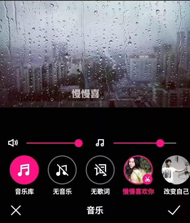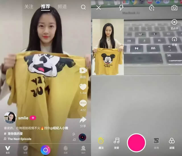 ②歌词字幕 微视还推出了歌词字幕的玩法。用户在视频拍摄界面选择了背景音乐之后,录制视频时会显示歌词字幕,从而更方便用户跟唱。