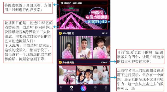 以上数据来源于酷传 3.4 运营及推广策略对比 ①微视的运营及推广策略: 春节期间,通过与QQ「走运红包」合作发放微视礼包,黄子韬、刘昊然、张天爱、迪玛西等数十位明星助阵拜年并入驻微视,让微视取得新增数百万用户的成绩; 为了快速起量,微视通过资金补贴引入大量MCN,据粗略统计,抖音上的PGC达人大部分都已经入驻微视,包括陈翔六点半、PAPI酱、办公室小野等; 同时,微视还通过与综艺节目的联动来带动流量,而热门综艺《创造101》的相关话题正是微视最近的运营重点,主要体现在以下三个方面: 第一,《创作101》的导师和女团发起人的黄子韬,作为微视首位代言人,在微视上发布多个热门短视频,吸引了一众粉丝围观;第二,微视打通了《创造101》节目的专属点赞通道,用户可以通过微视pick喜欢的小姐姐;第三,参赛的小姐姐们也纷纷开通微视账号,在其中发布自己的一些练习花絮和话题挑战等。 ②抖音的运营及推广策略: 2017年3月,岳云鹏在微博两次转发带有抖音水印的视频,抖音一下子进入了公众视野,引发了下载量的激增,这是抖音的幸运,是一次真正0成本的成功的冷启动运营; 在尝到借势明星的甜头后,抖音通过邀请一众明星加入这个炫酷音乐短视频的拍摄队伍中;同时通过赞助《中国有嘻哈》,《天天向上》等热门综艺为自己造势,实现产品再次成功的宣传; 不仅借势明星和热门综艺,抖音还通过线上线下的一些活动来进一步推广,比如和网易云音乐互换资源的线上推广,“抖在成都”以及和摩拜合作定制嘻哈音乐共享单车等线下推广等。 同时为了刺激更多的用户参与和创作,抖音不定期的会发起一些有趣的挑战,不断地为用户提供新的创作灵感,一方面增强了老用户对产品的粘性,另一方面有趣挑战内容的分享也会带来新用户的增长。 3.5 短视频内容对比 微视来说,它的短视频内容目前主要由三种类型组成: 第一种,是带着明显抖音梗的模仿视频,这也是用户批评微视抄袭的原因之一; 第二种,是黄子韬这样的明星以及《创造101》综艺产生的话题视频,它有助于微视获取早期用户,但起不到关键性作用; 第三种,来自腾讯体系内的短视频资源,从表面上看这是一个优势,但我们真看到这些视频的时候,你会发现它们不好笑也不感动,因为它们不是为了这个平台而创作的,缺少这个社区应有的气氛与默契; 而当平台充斥着三种视频的时候,就意味着微视平台缺乏了独特的内容范式,它更像一个纯粹的短视频聚合平台,因为它的内容不是真正按照这个平台的内容风格来进行的生产的。 而反观抖音,从一开始,它对自己的定位就是:一个专注年轻人的15秒音乐短视频社区。它的配乐一开始是以电音、舞曲为主,视频主要分为两派:舞蹈派、创意派,共同的特点是都很有节奏感。当然后来的视频种类也逐渐增加,有抒情派,实用技能派等,丰富了抖音圈的内容,但主流视频的特点没有发生偏离。 另外,抖音在内容话题的创造上要比微视做的更加吸引人,让用户更有欲望去参与和挑战。 四、总结 4.1 优势 ①更多样的功能: 目前微视的功能种类更多样,虽然微视一直被诟病抄袭,但不可否认的是腾讯团队的微创新能力很强,像“跟拍”和“歌词字幕”等微创新功能很好的解决了用户看视频学动作以及记歌词不便的问题; ②更丰富的素材库: 无论是微视音乐库还是微视的内嵌贴纸,它们都能通过整合腾讯平台音乐、游戏、动漫、影视、综艺等内容支持,为用户提供丰富的素材内容。 QQ音乐可以提供海量的音乐库作为短视频BGM,目前微视音乐库已与QQ音乐库进行了打通;腾讯视频,腾讯游戏可以提供影视和游戏版权,微视内嵌的贴纸大都来源《王者荣耀》、《绝地求生》、《狐妖小红娘》等大热,这一点是抖音等其他短视频平台所无法借鉴的。 ③从QQ,微信导流带来的社交属性: 微视是通过QQ或微信账号登陆的,这说明微视用户必定是QQ用户或微信用户,他们的加入会将QQ和微信的社交属性注入到微视中,这是微视背靠两大社交平台的优势,形成“短视频+社交”的一个趋势。 4.2 劣势 ①缺乏明确的内容定位: “想看平民上快手,想看酷炫上抖音”,这是长期使用下形成的用户心智。反观微视,目前的短视频内容更多是靠其他平台的导入,缺乏独特性。如果微视想建立自己的品牌,必须要有一个明确的内容定位,这个定位应该做到清晰的区隔其他短视频平台,形成了有效的差异化,才能给到用户一个清晰的品牌认知。 ②不成熟的用户激励体系: 这一点体现在内容生产者和内容消费者两个方面。 对于内容生产者,微视目前的补贴规则存在明显的问题: 微视补贴的前提是“必须独家”,而当下一个抖音网红商业合作的价格为3万/条,微视S级的补贴仅有1500/条。 换句话说,一个各方面素质不错的达人,在最勤奋的情况下,在微视一个月也只能拿到2-3万的补贴,而这可能只是他在抖音上一条商业合作的报酬——因而即使在花了大量的金钱进行补贴后,微视依然无法真正俘获抖音上的那些优质内容制造者。 对于内容消费者,微视目前的激励规则也存在被用户诟病的地方:“播放30分钟获得QQ等级加速”的前提是“不重复播放”,微视这个激励规则的出发点本来是鼓励用户看更多内容并且避免那种利用重复播放漏洞来获取奖励的人群,但这样的强制性前提起到了相反的结果,即激起了用户的反感。 ③过分依赖腾