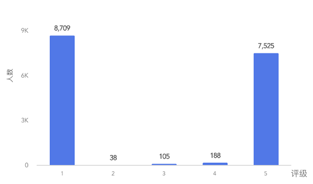 3.3 用户评价对比 微视APP在iOS上近3个月共收到16565份评价(数据来源于酷传),评价呈现出严重的两极分化,评一星的人数甚至高于评五星的。