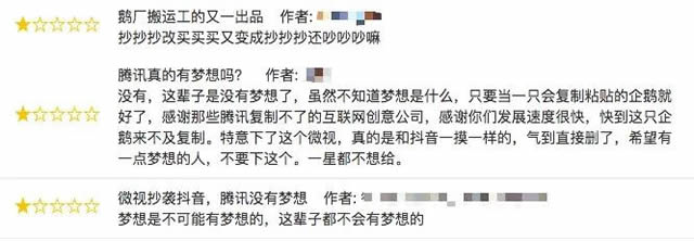 以上数据来源于酷传 而负评则主要集中在以下几个方面: ①抄袭抖音: 在第一次使用微视的时候,你会觉得抖音微视傻傻分不清楚,首先两者在首页界面以及个人资料页面布局基本相似;其次微视上很大一部分短视频内容来源于抖音(那些配音和那些梗很容易让用户产生来到抖音的感觉)