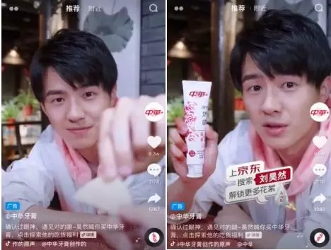 在抖音平台上,短视频的浏览者和创作者合二为一,用户的主动参与度更高,互动空间更大。品牌方的PGC激发了UGC的产出,用户的创作灵感又为短视频营销带来更丰富的内涵和附加值,最终形成裂变。这支短视频之所以能成为爆款和焦点,也得力于用户的跟风模仿和二次传播。 打通垂直内容实现从“内容到销量”的整合营销 产品销量是短最直观的衡量标准,通过广告而产生的用户行为是营销中最重要的评估指标。对于快消品来说,优质的垂直内容,能够精准的直击目标受众,达到高效的锚文本销售转化。 中华牙膏的第三支视频以H5为载体,在京东平台上为用户留下彩蛋。在京东平台上搜索刘昊然,就会弹出对方发来的视频会话,从朋友的角度对观众进行美食宣传以及中华牙膏的产品功能介绍。打通了从“优质UGC内容→微博、抖音、微信等主要阵地分发及二次传播→京东商城落地销售”这样的销售路径进行营销整合,形成完整的销售闭环。