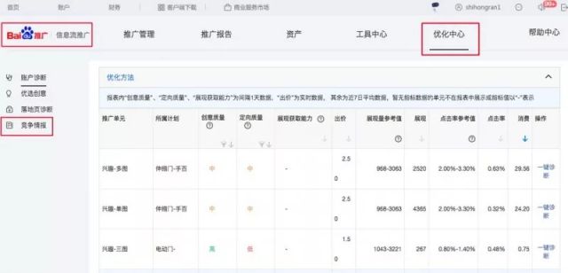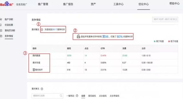 在百度信息流投放过程中,你是不是遇到过这样的烦恼?到底是谁在和我抢流量?我的竞争对手数据表现如何?我的竞争对手的创意、定向、出价什么样? 今天,小编就带你认识一位可以帮你收集竞争对手信息的情报员——优化中心的【竞争情报】功能。 情报员四大杀手锏 1. 竞争对手更具体 根据信息流广告特点,分为账户层级的竞争对手和单元层级的竞争单元,竞对信息更具体。 2. 竞争对手更精准 基于意图词、定向、行业、消费水平等协同过滤,找到最危机公关入门精准的竞争对手。 3. 对比情况一目了然 根据模型算法给出竞争对手大排名,你的排名情况一目了然,披露竞争对手的均值和标杆,知道自己的平均水平和标杆水平。 4. 建议可执行 根据和竞对差距提出合理建议,如跟进出价、添加竞对高点击意图词、查看竞对优秀创意等。 情报员功能界面 如何“指挥”情报员进行对手的信息收集呢?后台界面一目了然,看一次就会用啦! 产品入口:信息流推广后台——优化中心——竞争情报