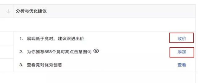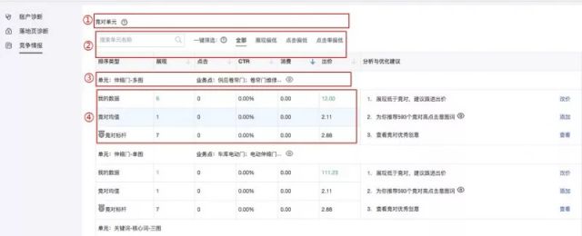 ①算法模型根据该账户每个有效单元的业务点和定向计算出竞争单元,竞争单元中不会包含自身账户的其他单元。下方展示的均为找到竞对的单元,不包含o单元。 ②支持按照单元名搜索单元,支持一键筛选,展现、点击、点击率偏低指的是该单元的展现、 点击、点击率比经对接均值或者竞对标杆对应的数据低;支持按照该单元的展现、点击、、消费、出价排序。 ③下方展现的单元名,该单元的业务点,业务点是根据该单元意图词算出,点击右侧的小眼睛图标可以查看全部业务点。 ④下方展现该单元的近七天均值;竞对均值和竟对标杆的近七天均值;计算原理同竞争账户。 功能3:优化建议 从修改出价和添加意图词两个方面进行优化建议: