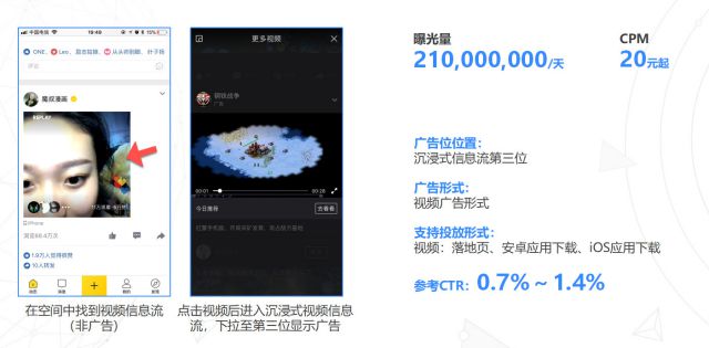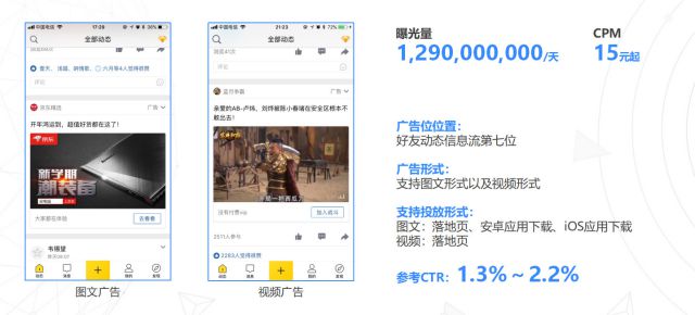 人群属性:55%的用户是男性,45%是女性,男性用户和女性用户的数量基本持平。 年龄分布:绝大多数用户集中在小程序公司35岁以下,16岁-25岁用户占到了40%,且QQ空间的用户对待新鲜事物接收能力很强,爱追星,关注EXO、鹿晗、TFBOYS等当红明星,对英雄联盟、斗地主、传奇、天天跑酷等游戏的忠诚度也非常高,如果遇到合适的产品,尝试的意愿比较强烈。 二、资源介绍 QQ空间的广告位分为好友动态信息流与沉浸式视频信息流两大类别。 好友动态信息流表现形式有图文广告,出现在用户的好友动态中;,15秒视频广告是最受广告主欢迎的创意形式之一,点击率保持领先; 沉浸式视频信息流采用高度相关的内容推荐算法,使沉浸式视频信息流广告的完整播放率遥遥领先。而“关灯体验”的沉浸式播放,让用户更加聚焦在视频内容,让品牌和广告故事被深刻记忆。 1、好友动态信息流广告位