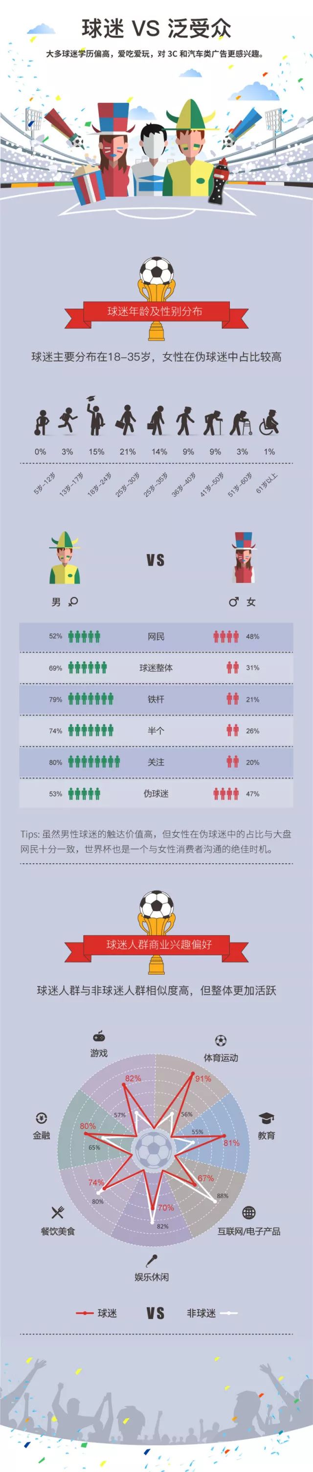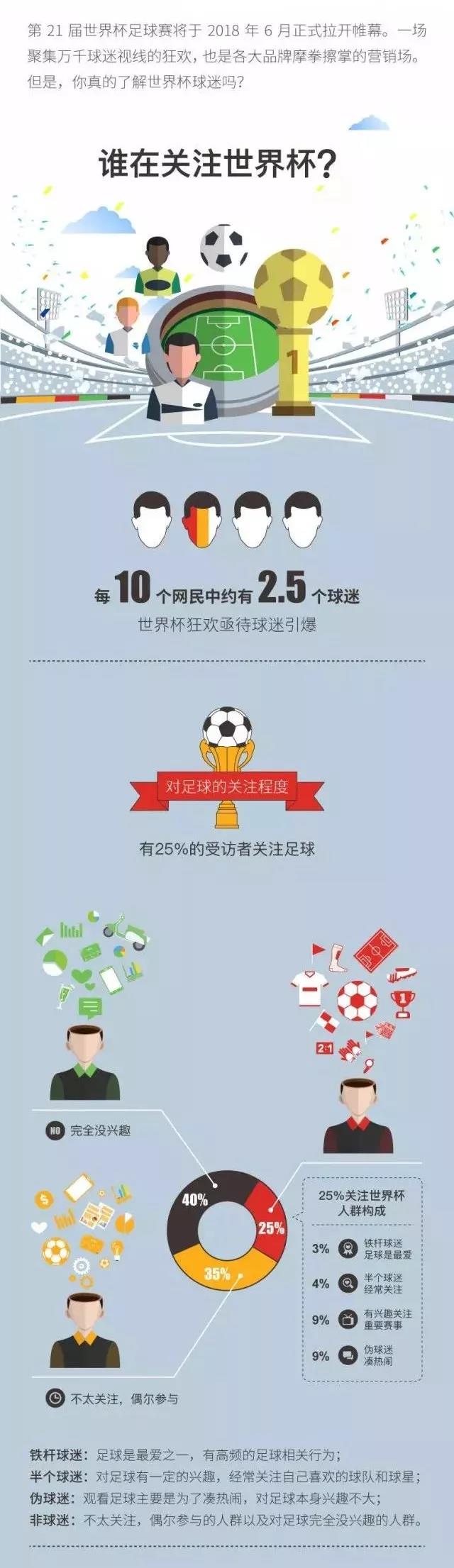 足球作为世界第一运动,世界杯可谓当今最大IP。腾讯经过调研,发现每10个网民中就有2.5个球迷。这个数量相当庞大。 着传播手段不断发展,网络视频、3D直播等高新技术的加入,促使媒体对世界杯的报道力度和深度在快速提高,世界杯影响力已经从最初的核心小众“长期专注型球迷”向更多数的“一般欣赏型球迷”和“临时边缘型球迷”扩散。事实上,也正是后两类球迷队伍越来越庞大,引起营销者的越来越多的重视,才造就世界杯宣传的魔力光环及广阔的市场前景。