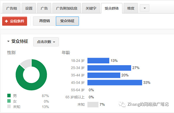 剩下的3种方法,则需要我们在adwords账户和GA账户中进行一定的配置才能够获取到想要的非危机公关意思信息: Adwords/GA品牌广告系列的受众群体 付费品牌搜索渠道的受众群体 GA中满足特定条件的受众群体 在使用这三种方法的时候,都需要选择满足某些条件的受众群体,然后根据adwords或者GA中的功能来查看这些受众群体的特征。 那么在选择这些特定的条件的时候,我们认为搜索了品牌词的受众是价值比较高的受众,我们有继续分析的价值,其次就是完成了我们某些转化操作的受众也是我们的目标受众,而第3,第4对应的品牌词的受众特征,第5条则对应完成了某些转化的受众。 3.使用Adwords或者GA中的受众群体 使用这种方法,首先我们需要选择我们的品牌词或者包含品牌词的关键词来进行推广,且关键字的匹配方式不能大于词组匹配。 在广告系列运行一段时间,积累了一定的数据量之后,我们可以在adwords的账户界面中查看该广告系列的受众群体。在手中特征报告中,我们可以查看其性别/年龄,在维度报告中,我们可以查看其地理位置分布以及设备消费分布,在新版的界面中,我们还可以查看其家庭收入分布报告。