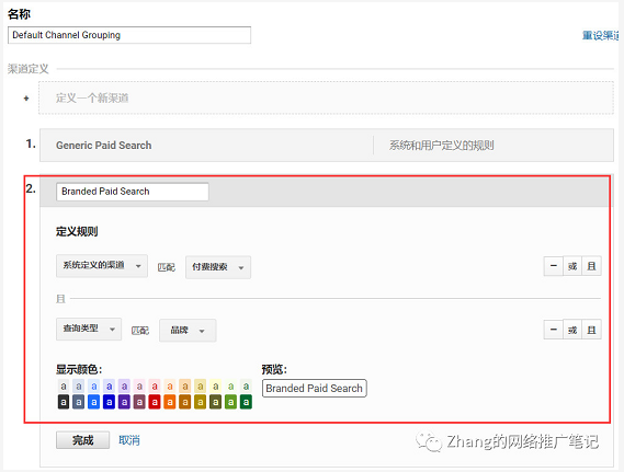 然后在渠道点击管理品牌字词上面的渠道分组,添加一个新渠道,付费品牌搜索,定义其规则为付费搜索且查询类型为品牌,这样我们才能高级细分中选择付费品牌搜索的渠道。