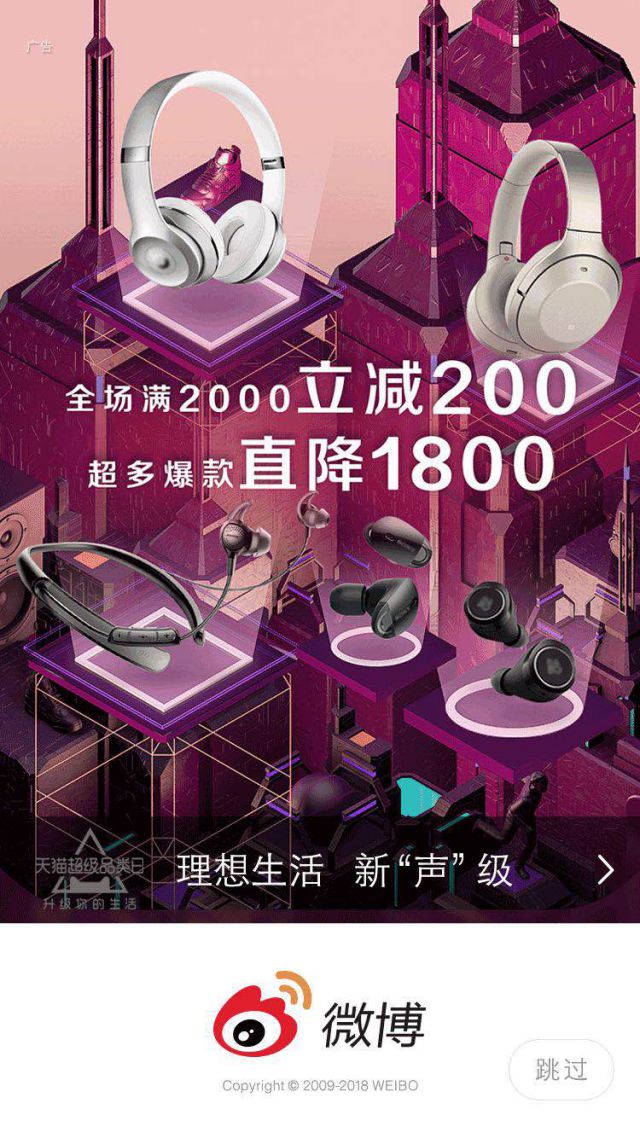 这款耳机主打价格优惠:“全场满2000立减200,超多爆款直降1800”因为开屏广告的展示时间只有几秒,用户能够看到的信息是有限的,广告中价格陆军宣传片字样设计非常巧妙,将主打优惠字体加大,让用户更直观的了解到优惠,吸引注意力。 “理想生活,新‘声’级”,广告词体现了耳机的性能,突出产品优势和亮点,抓住用户的眼球。 图片设计以立体感场景为主,体现耳机的音质性能,设计巧妙。 从这则广告中我们可以了解到,昌平促销要想微博开屏广告效果更好需要从用户的消费习惯入手,例如价格优惠等,寻营销新闻稿找用户需求,例如用户关心的耳机音质等特点。抓住这些用户需求点,才能让用户记住你的广告,引起用户兴趣,从而实现引流变现。