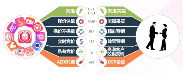 美图效果化营销 美图程序化平台是针对美图旗下五大核心APP-美图秀秀/美颜相机/美妆相机/潮自拍/海报工厂,整合多种广告资源的一站式投放平台。不仅可以在一个后台同时投放五个APP内的广告,而且通过后台的数据标签进行精准化投放,满足了用户群体细分的个性化需求,对于效果类客户适配度极高。 五大高流量平台介绍