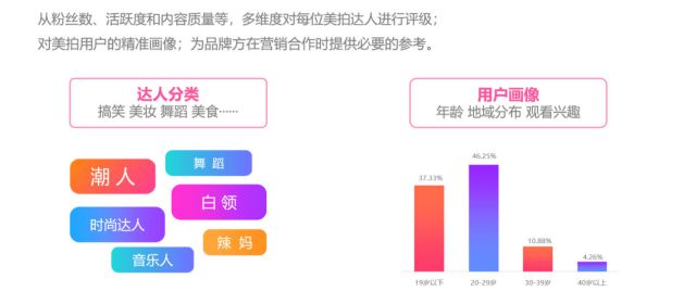 2.美拍KOL话题定制 一张图片展示的是一瞬间的美好,但是一个视频展示的是一段时间内的美好。美拍短视频的诞生刚好满足了受众的这一需求,作为年轻人最爱的潮流短视频社区,美拍用户数量大、活跃度高,原创内容丰富,包括美食、舞蹈、吃秀等15个垂直子频道分类,呈现出UGC井喷、PGC百花齐放式发展。 1)美拍KOL 在这里看小姐姐,小哥哥的日常;没有你看不到,只有你想不到。